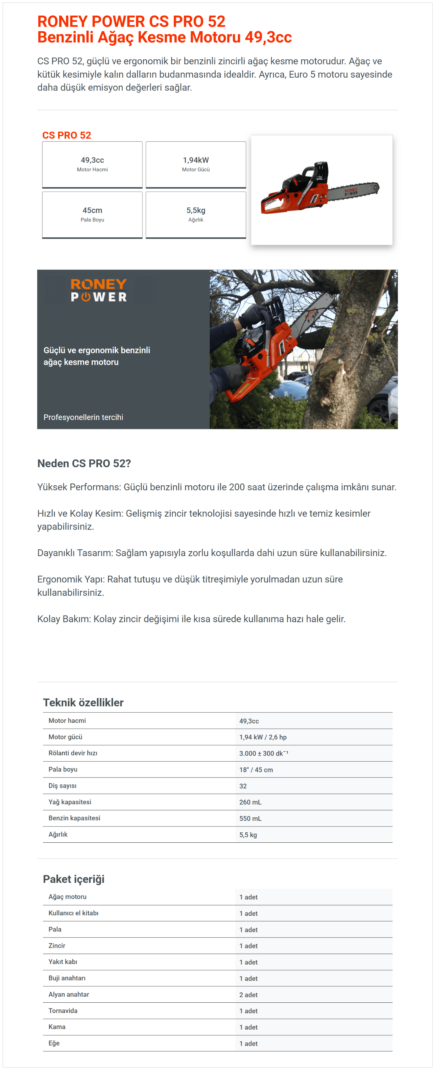 Roney Power CS Pro 52 benzinli ağaç kesme motoru, 49.3 cc motor gücü ve 2.6 HP/1.94Kw performansıyla odun kesimi ve bahçe işlerinde etkili kullanım sunar. 45 cm (18 inç) pala uzunluğu sayesinde geniş kesim imkânı sağlar. 5.5 kg ağırlığı ile dengeli ve kontrollü bir kullanım sunar.